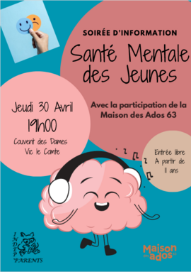 L'association Indep'parents organise une soirée d'information sur la santé mentale des jeunes le jeudi 30 avril à 19h au Couvent des Dames de Vic le Comte.